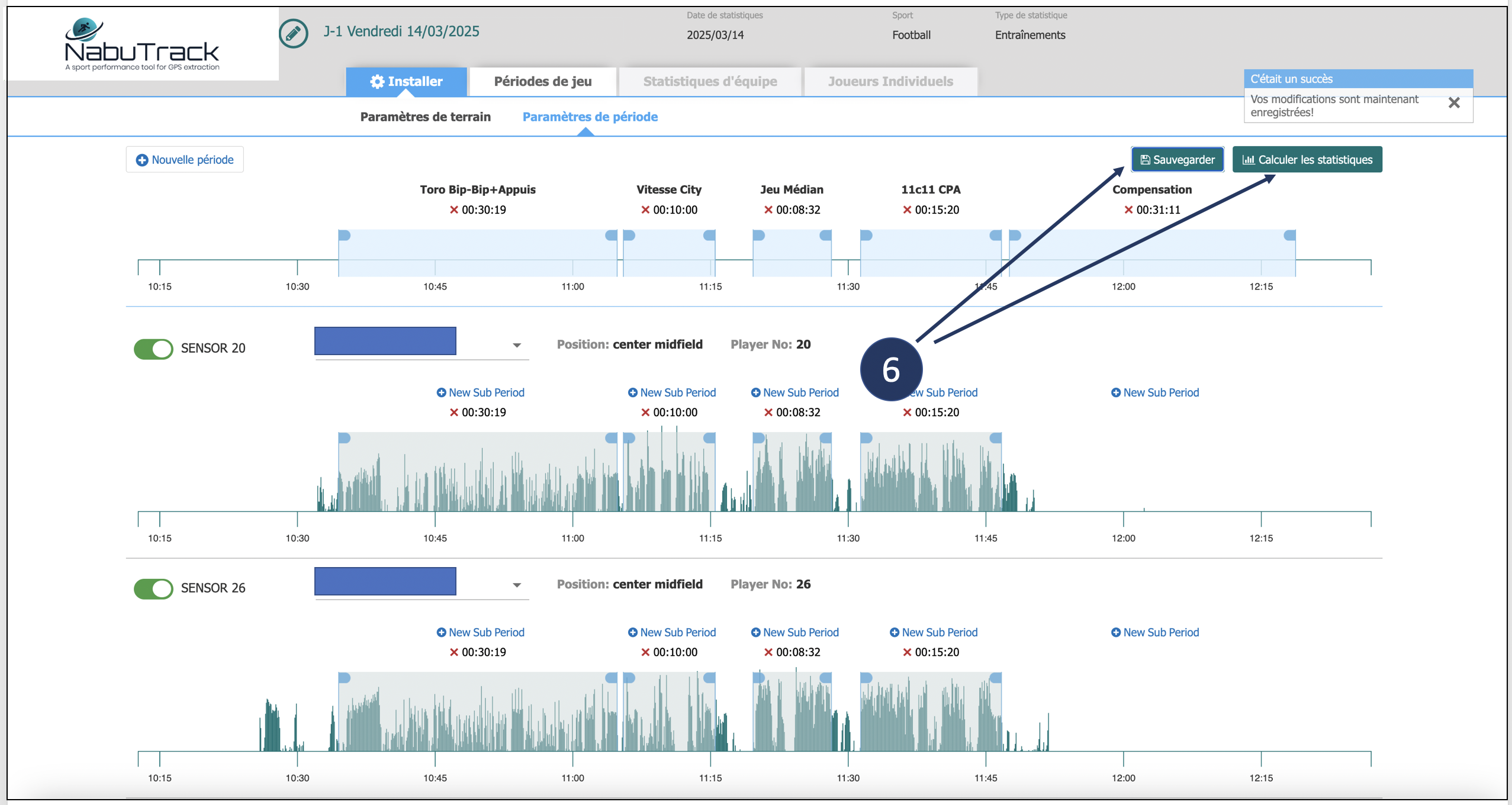 Etape 5 : Comme nous l'avons vu, la création des différentes périodes s'applique à l'ensemble des joueurs. En parallèle, NabuTrack vous permet de personnaliser ces périodes pour chacun de vos joueurs. Cela vous sera utile pour vos matchs, cette personnalisation étant indispensable pour les joueurs qui sont remplaçants et ceux qui ne finissent pas le match. Idem lors d'une séance d'entraînement lorsqu'un joueur ne participe pas un ou plusieurs exercices. Ceci est important pour la cohérence de vos statistiques, En effet, si les périodes ne sont pas personnalisées, leurs moyennes prendront en compte toutes les données de votre effectif, même celles qui seraient éventuellement absentes.