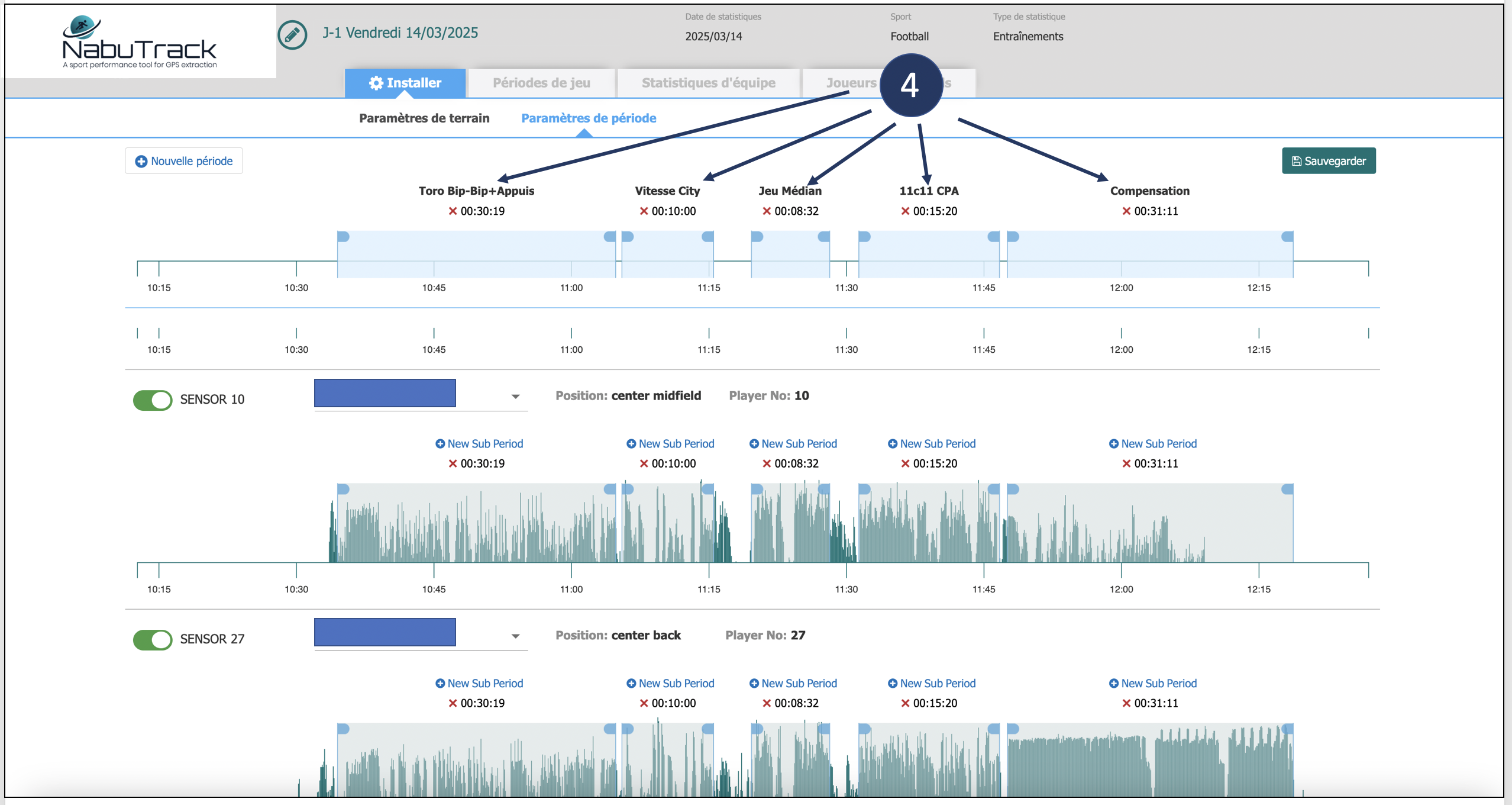 NabuTrack vous permet d'analyser vos données dans la globalité de votre session, ou par séquence, c'est à dire par mi-temps pour un match ou par exercice lors d'une d'entraînement. On parlera dans les deux cas de période.