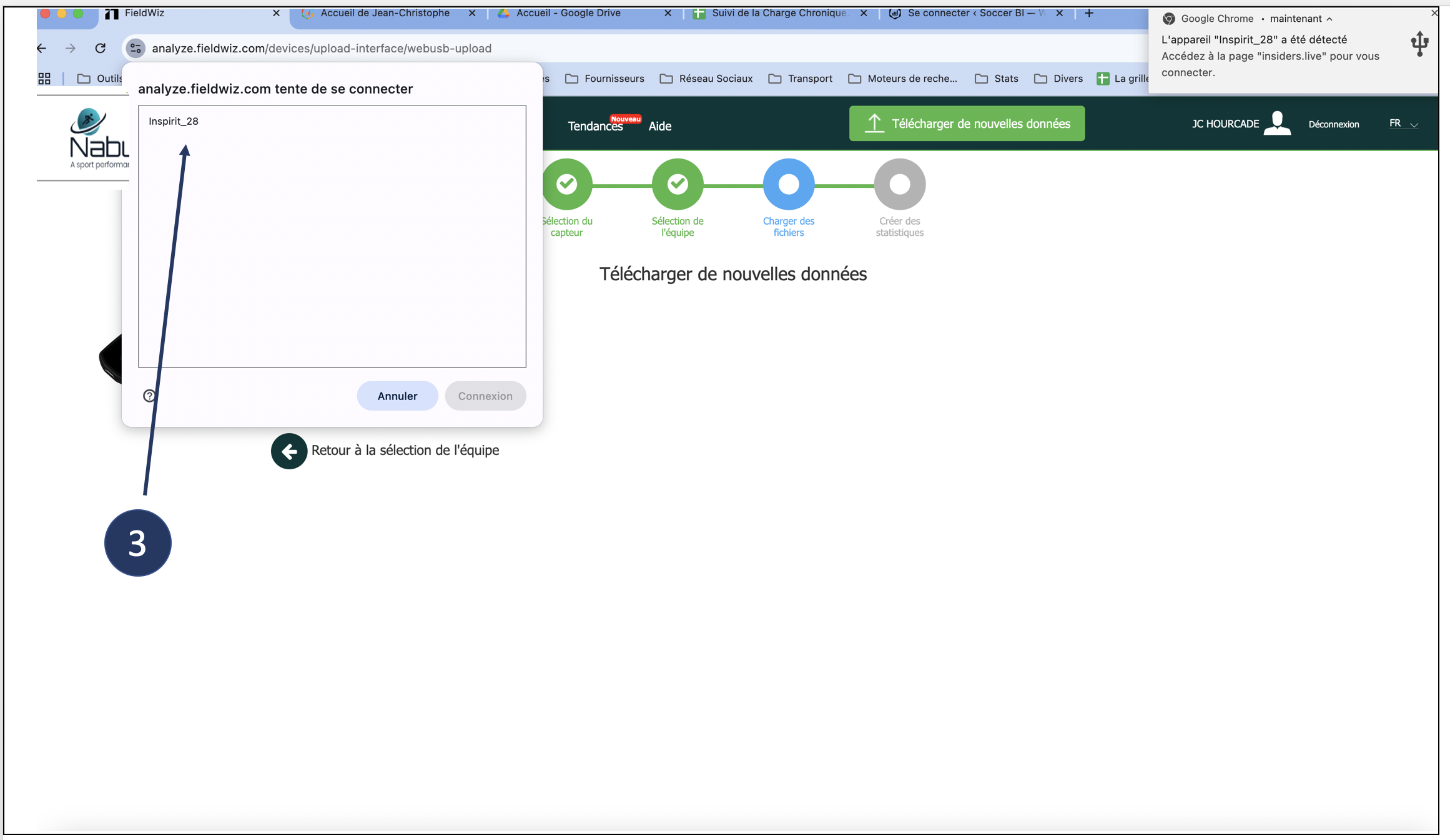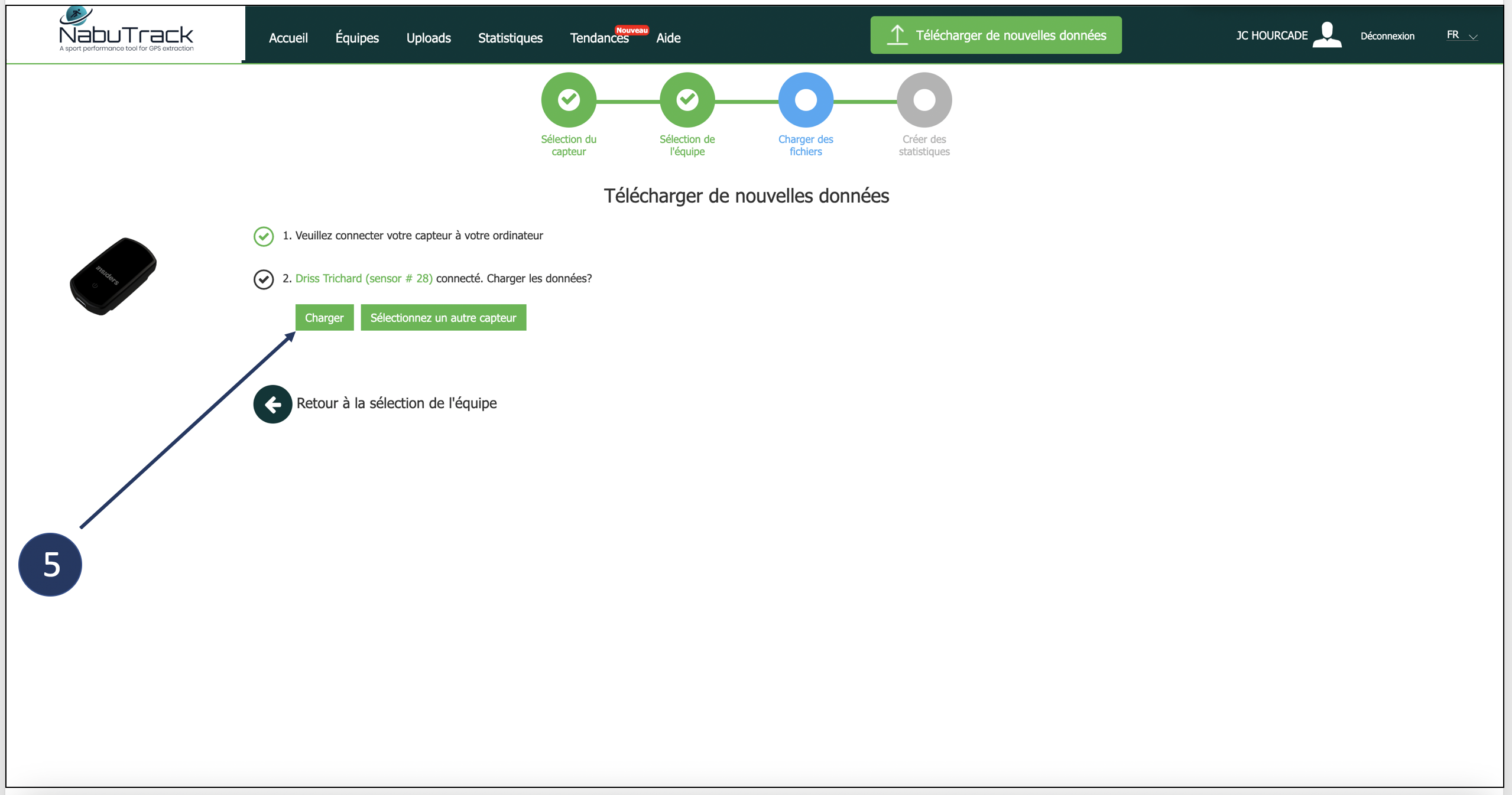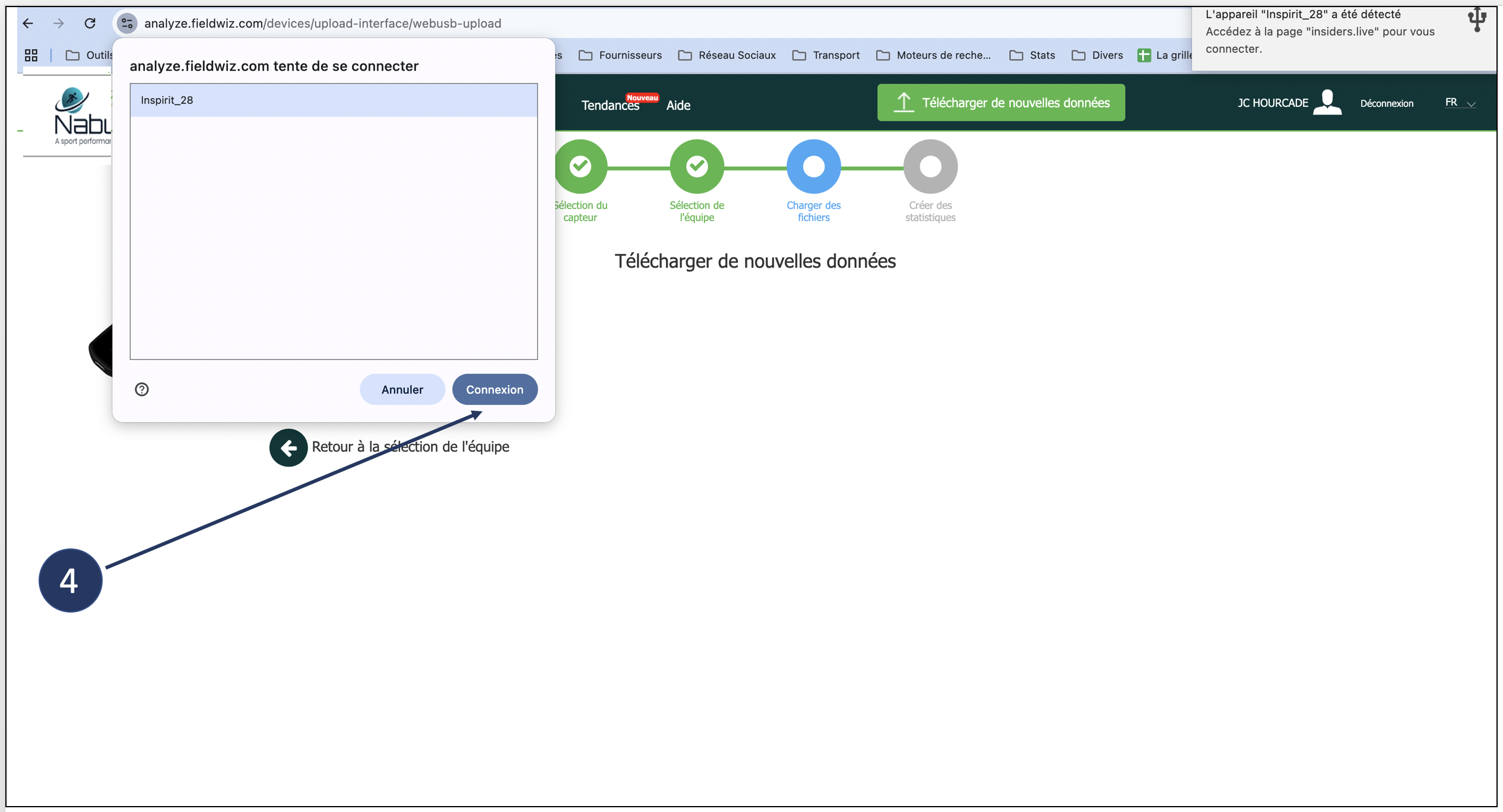 Etape 3 : Comme lors de l'étape d'association du GPS avec un joueur, sélectionnez le GPS qui apparaît dans la fenêtre PopUp sur l'écran de votre ordinateur