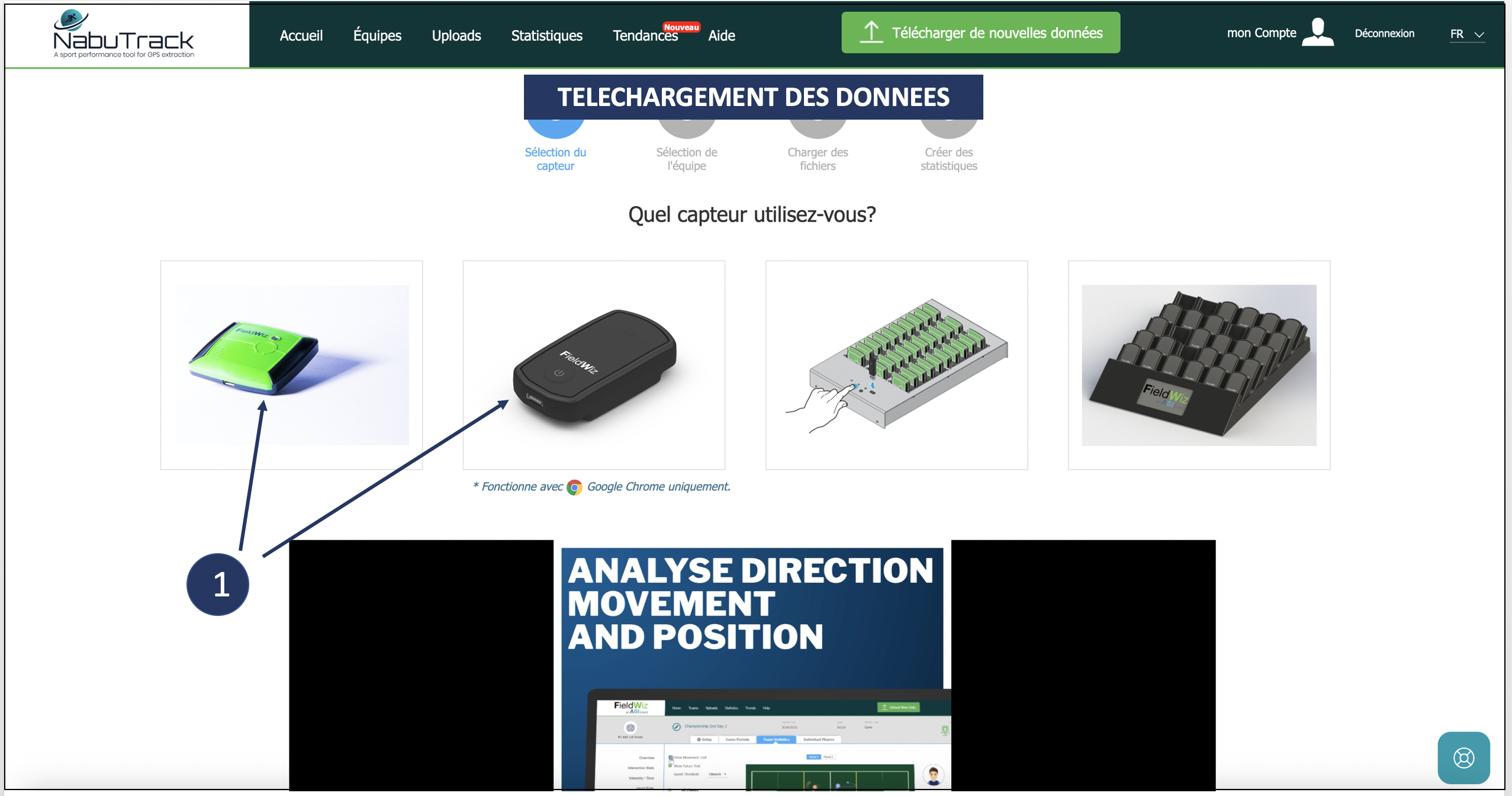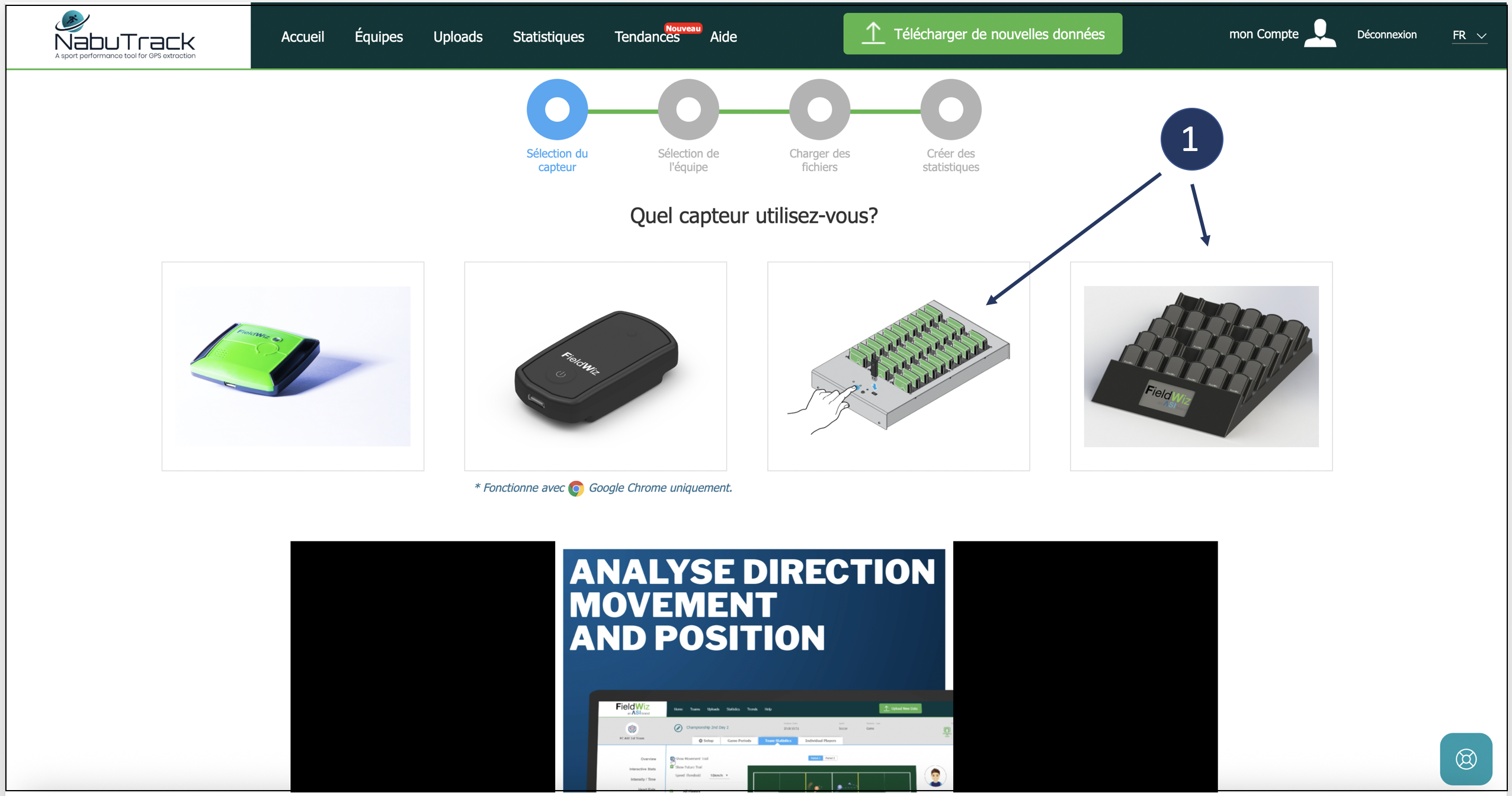 Etape 1 : Choisissez le type de capteurs que vous possédez (FieldWizV1 = GPS Vert) ou FieldWizV2/InspiritV2= GPS noir) et cliquez sur l'image du GPS de votre choix