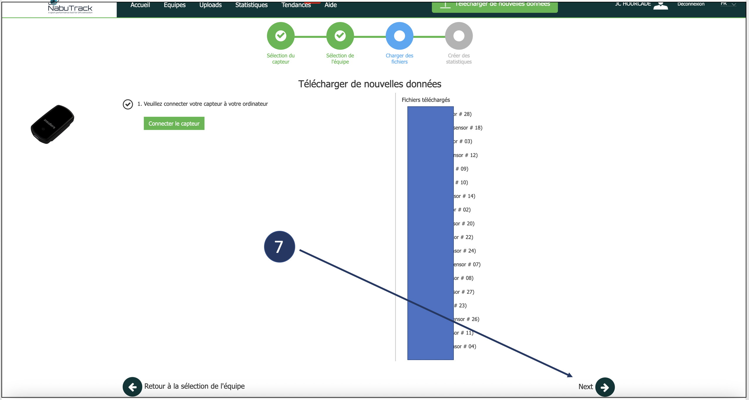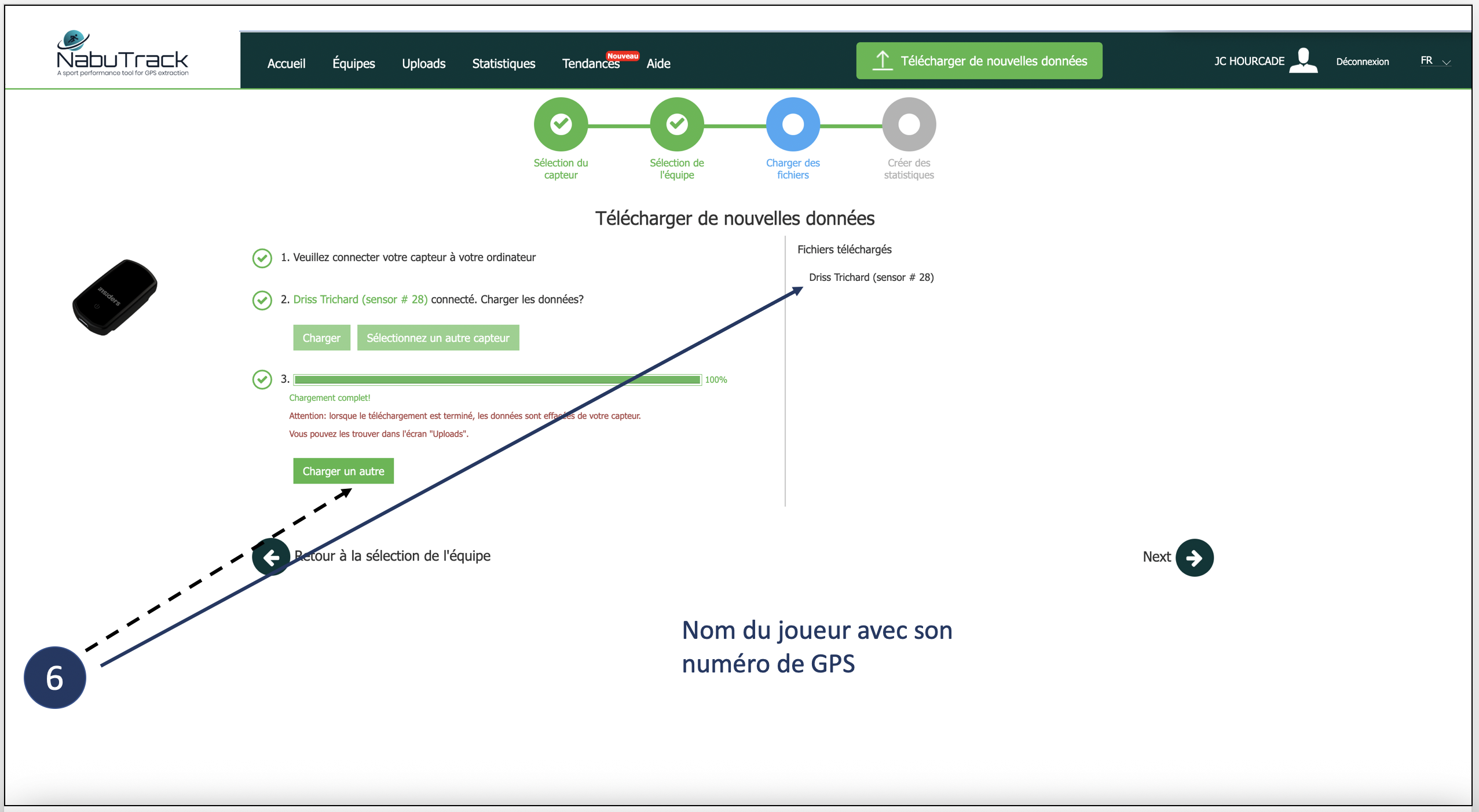 Etape 5 : Après avoir établi la connexion, le numéro/nom du joueur apparait à l'écran. Cliquez sur "Charger". Après que le(s) fichier(s) ai(en)t été chargés (illustré par un curseur qui atteint 100%), le nom du joueur est mentionné à droite de l'écran, ainsi qu'un bouton "Next" que vous utiliserez après.