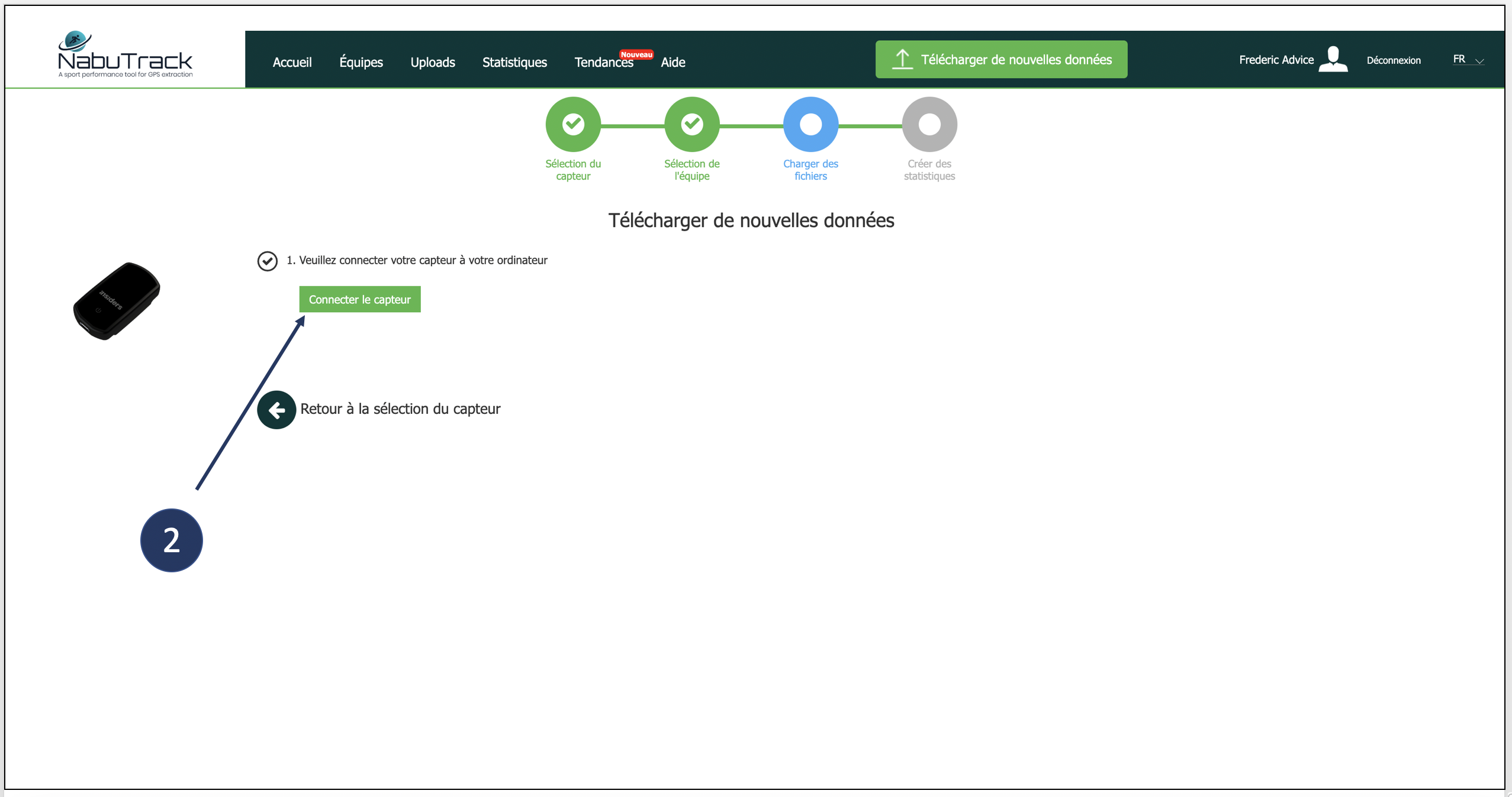 Etape 2 : Après avoir branché votre 1 er GPS à votre ordinateur à l'aide de votre câble usb-c Haut Débit, cliquez sur "Connecter le capteur"